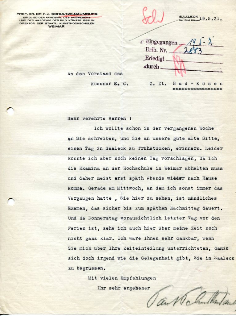 Der Architekt, Kunsttheoretiker, Publizist und Politiker Paul Schultze-Naumburg, der in nachstehendem Schreiben den "Vorstand des Kösener SC" zum Frühstück lud, war in den Zwischenkriegsjahren der prominenteste Einwohner Bad Kösens. Er wurde 1869 in Almrich bei Naumburg als Sohn eines Porträtmalers geboren und wuchs in einer künstlerisch geprägten Atmosphäre auf. Zum Freundeskreis der Familie gehörten Emanuel Geibel, Franz Kugler und der junge Friedrich Nietszche. Schultze-Naumburg besuchte die Domschule und das Realgymnasium in Naumburg, die Kunstgewerbeschule und die Badische Landeskunstschule in Karlsruhe.